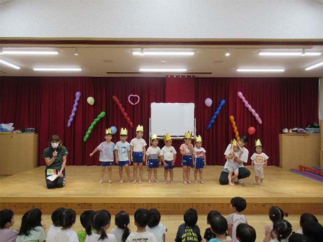 今月は、ひよこ・らいおん組以外のクラスから、8名の誕生者が冠をかぶって舞台に登場!!