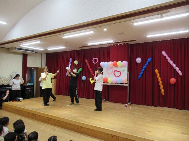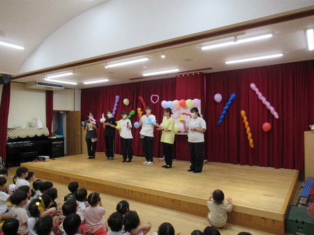 保育士の出し物は、「マジックショー」でした。水の色が変わったり、破いて小さくなったはずの新聞紙が大きくなったりしたので、ビックリしたり、「すごーい!!」と大拍手でした。