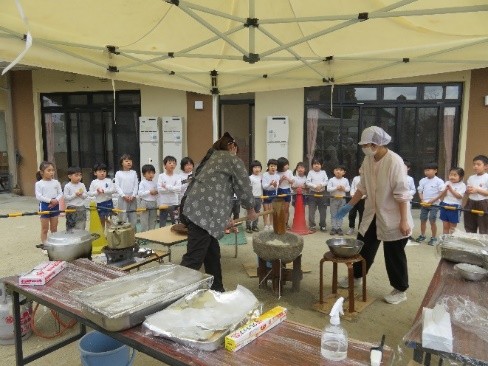 順番に担任の先生がもちをつく姿に、「よいしょ!!よいしょ!!」とかけ声を掛けたり、「がんばれー!!」と応援してくれた子ども達でした。