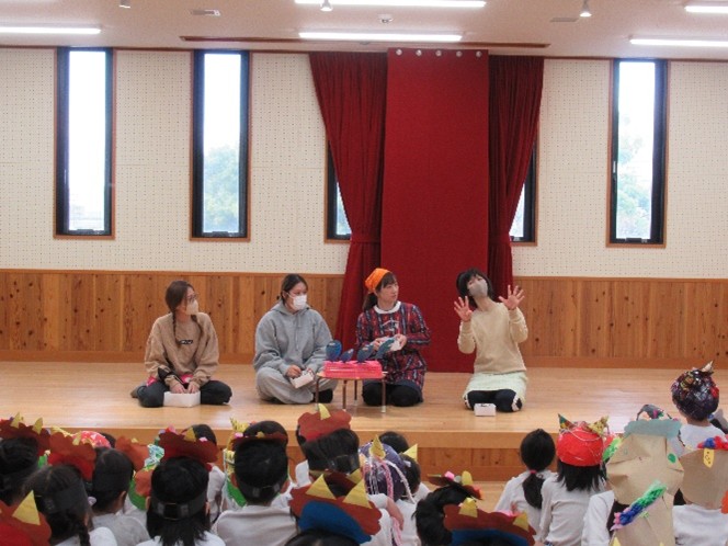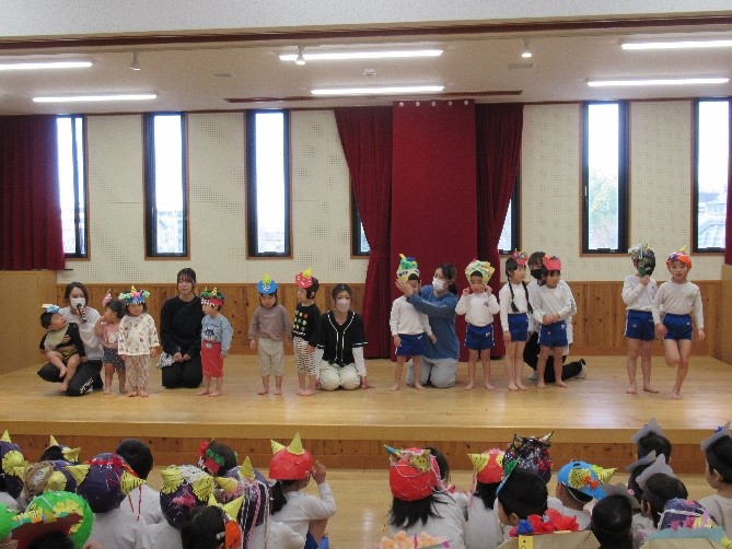 クラスごとで作った鬼のお面の紹介をしたり、保育士の劇「節分の話」を観たり、豆まきの歌をうたったり、みんなで楽しい時間を過ごしました。