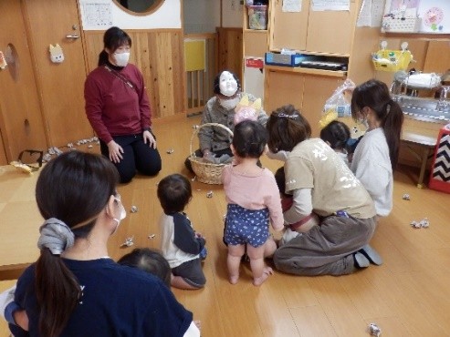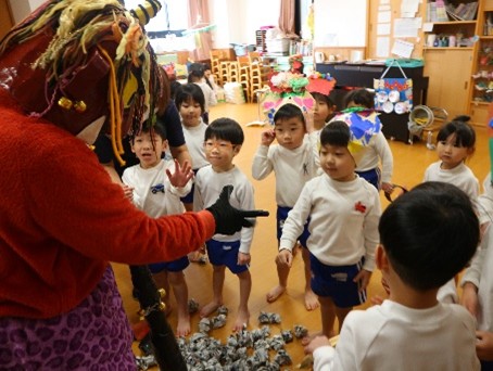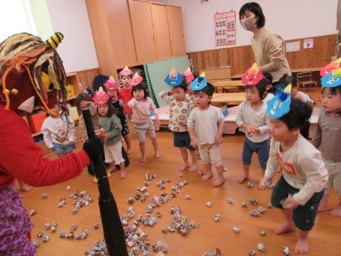 各クラスには鬼さんからの手紙が届き、「おなかのなかにいる、悪い鬼を退治してね。」という内容が書かれていて、ドキドキ気分で豆まき遊びをしていると部屋に赤鬼・青鬼が登場!!