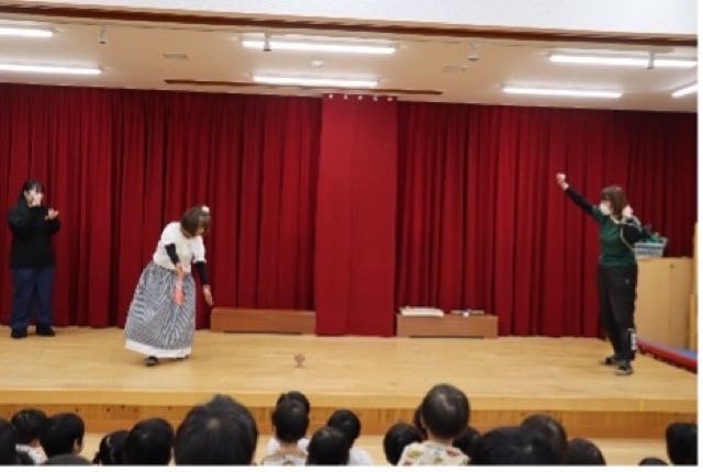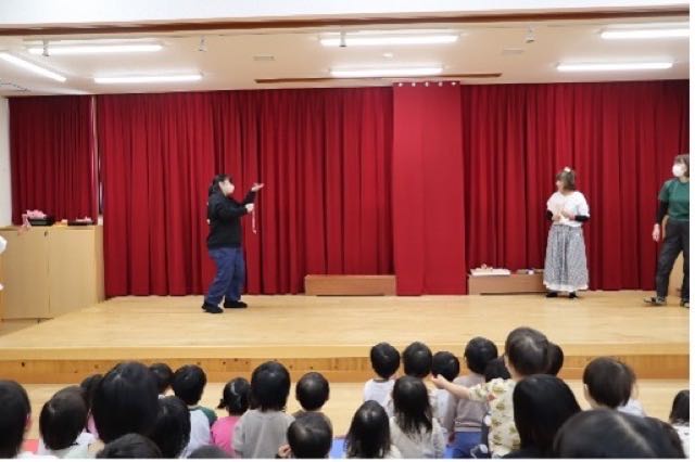 クラスごとで作った鬼のお面の紹介をしたり、保育士の劇「節分の話」を観たり、豆まきの歌をうたったり、みんなで楽しい時間を過ごしました。