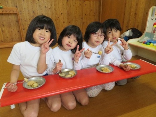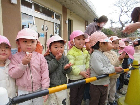 鬼を退治した後には、理事長先生の「福の神」が、おやつの「福豆ボーロ」とイワシとヒイラギの葉を持って来てくれました。