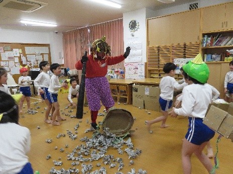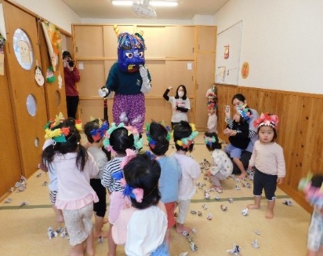 各クラスには鬼さんからの手紙が届き、「おなかのなかにいる、悪い鬼を退治してね。」という内容が書かれていて、ドキドキ気分で豆まき遊びをしていると部屋に赤鬼・青鬼が登場!!