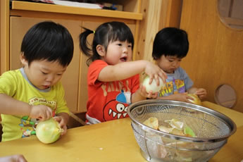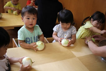 「せんせ~みて~」と白くなった玉ねぎを見せている子もいました。