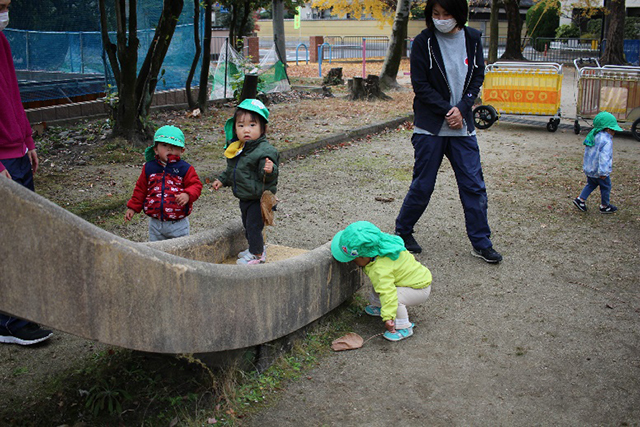 地面にもぐらさんの穴があり「ここにいるかな?」「こっちにもあったで~」ともぐらさんの穴探しにも夢中になっていました。