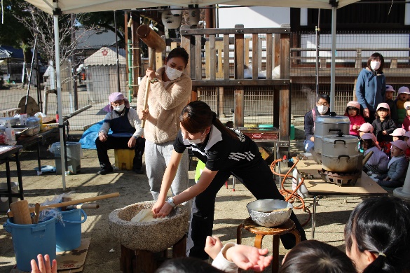 園長先生や保育士が付く姿に自然と「がんばれー」と応援したり、「よいしょー!」と掛け声をかけていました。出来上がったお餅をすぐその場で食べみんな「おいしいな~」「もうなくなっちゃった」とぺろりと食べていしまっていました。